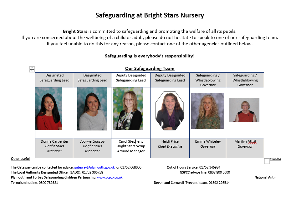 At the Bright Stars we have a strong commitment to safeguarding and promoting the welfare of all children. We work together with a range of other agencies to ensure that we are able to identify, assess, and support children who may be suffering harm.